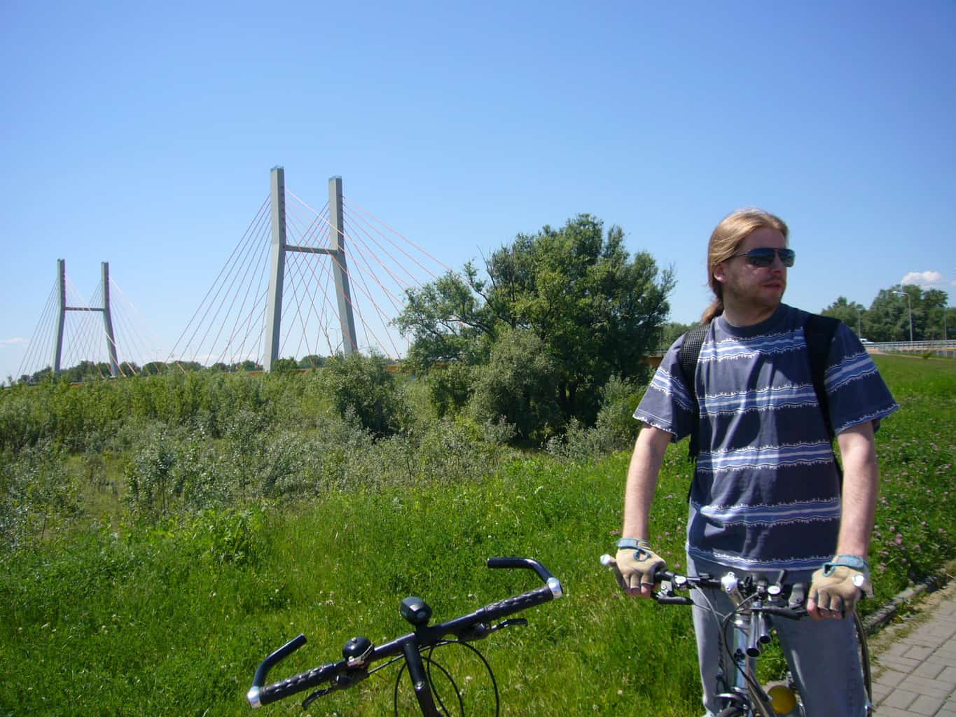 Wybraliśmy się na początku nad Wisłę – poziom wody był bardzo wysoki. Tu na tle Mostu Siekierkowskiego: