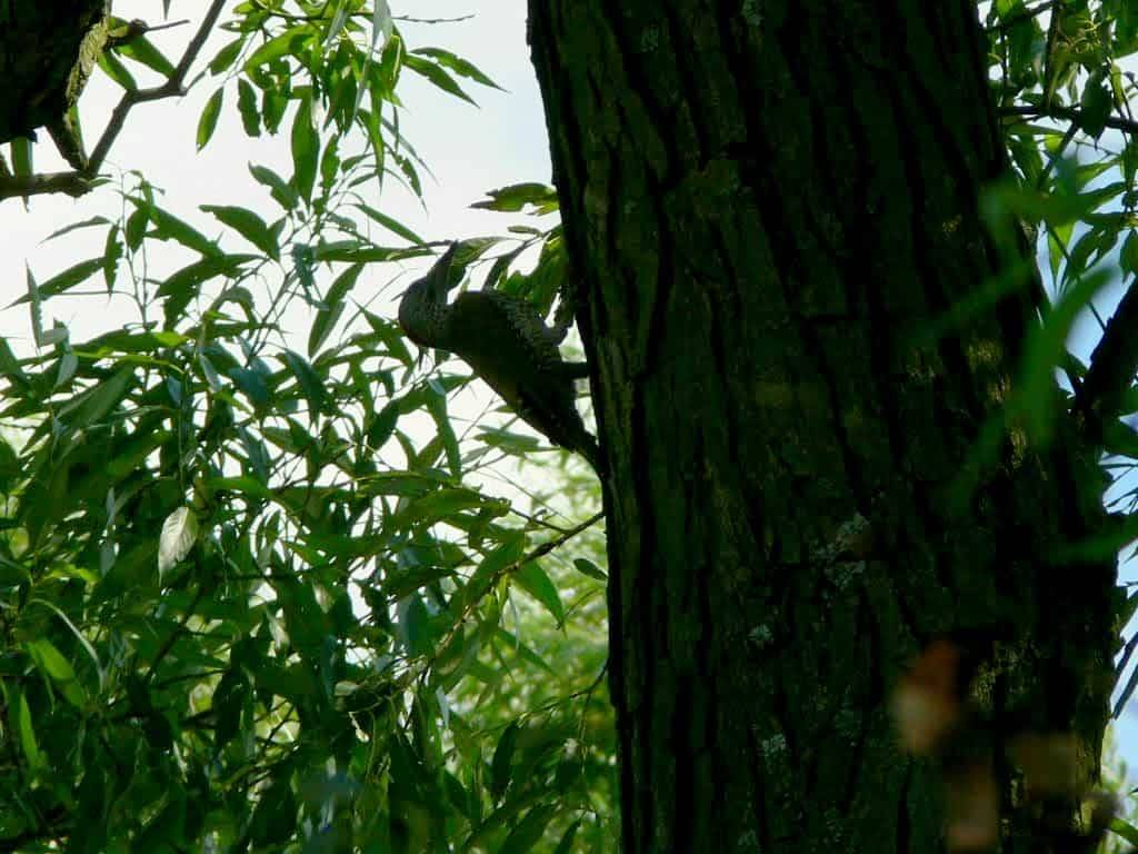 Jadąc dalej, nagle przeleciały nam przez drogę, pogwizdując, kolorowe ptaki. Okazało się, że to dzięcioły zielone, znane z tego, że gustują w mrówkach i poczwarkach, przez co rzadko bębnią w drzewa. Za to ich język potrafi wysuwać się poza dziób na odległość równą aż 1,5 długości czaszki z dziobem.