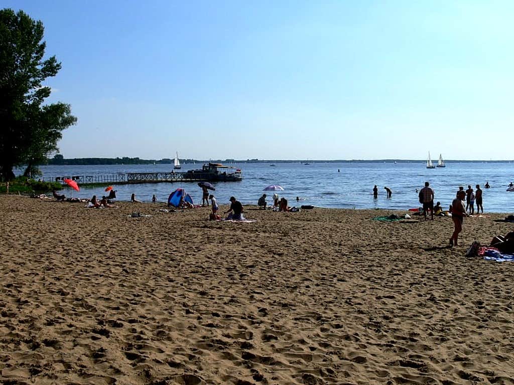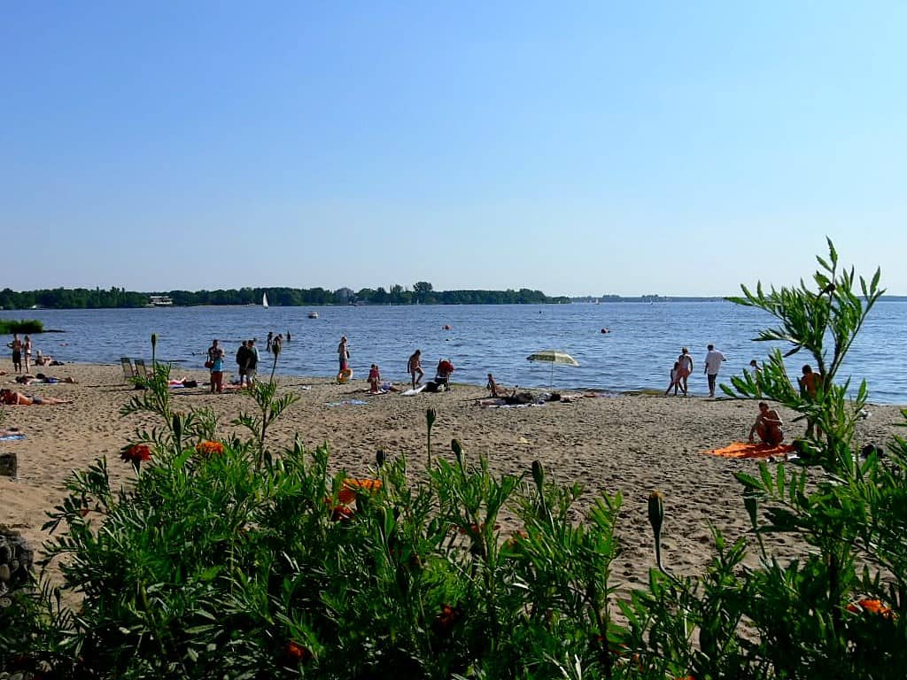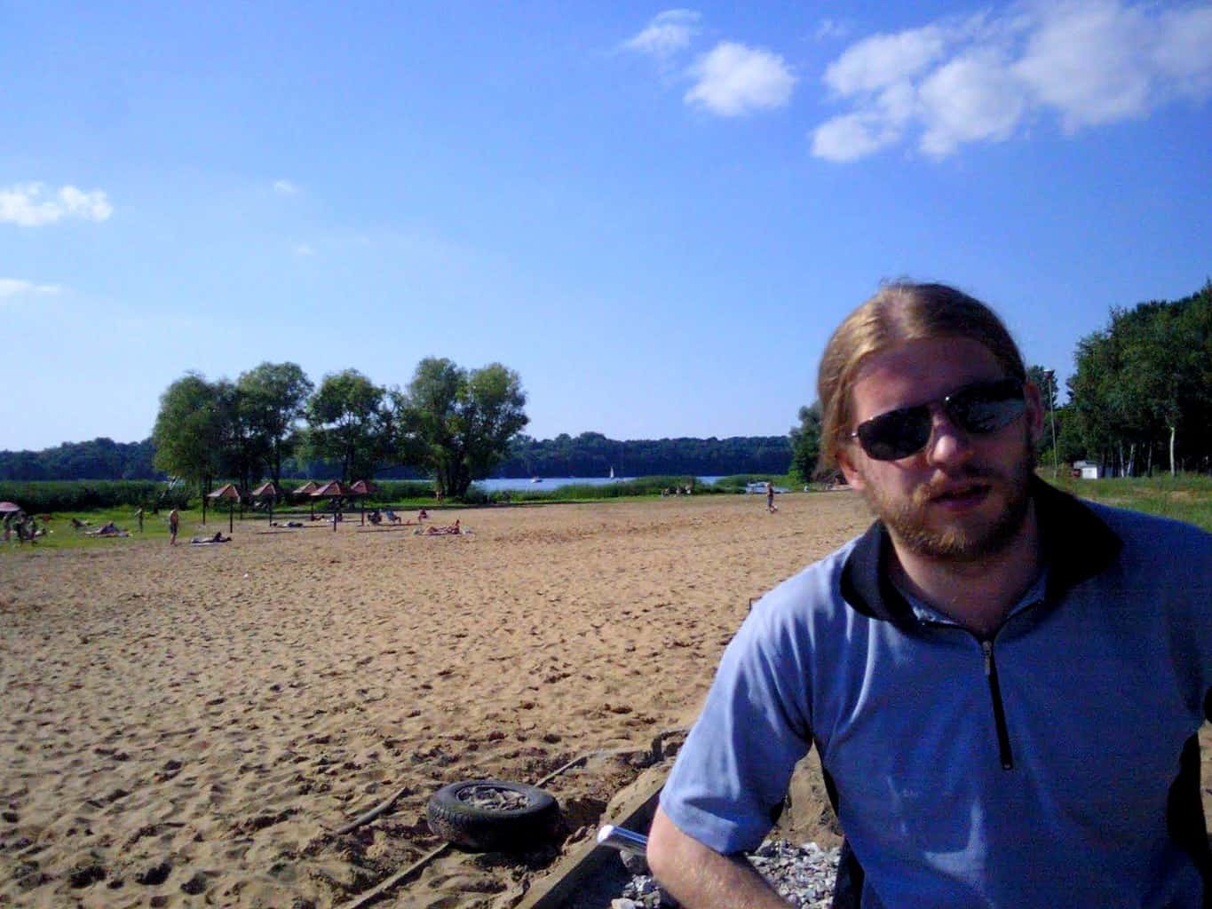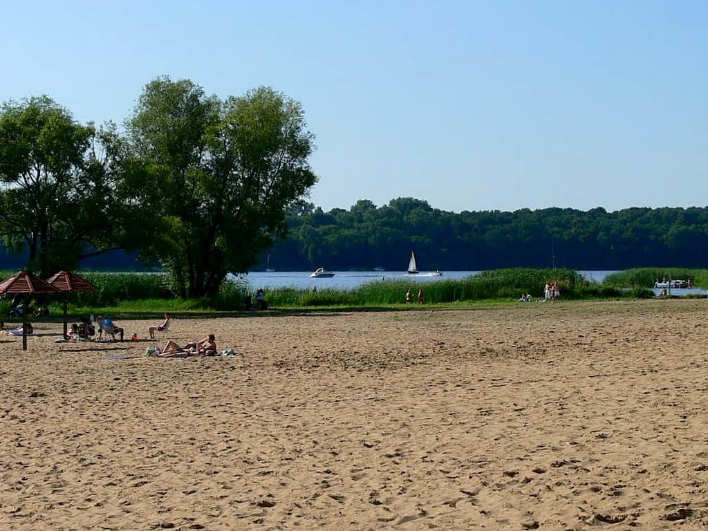 Dalej pojechaliśmy brzegiem jeziora w stronę Białobrzeg – kolejnej miejscowości nad Jeziorem Zegrzyńskim. Mijaliśmy też różne mniejsze ośrodki po drodze – ale plaże nie były już tak imponujące jak w Ryni, w niektórych miejscach nad wodą było nawet więcej śmieci niż ludzi…