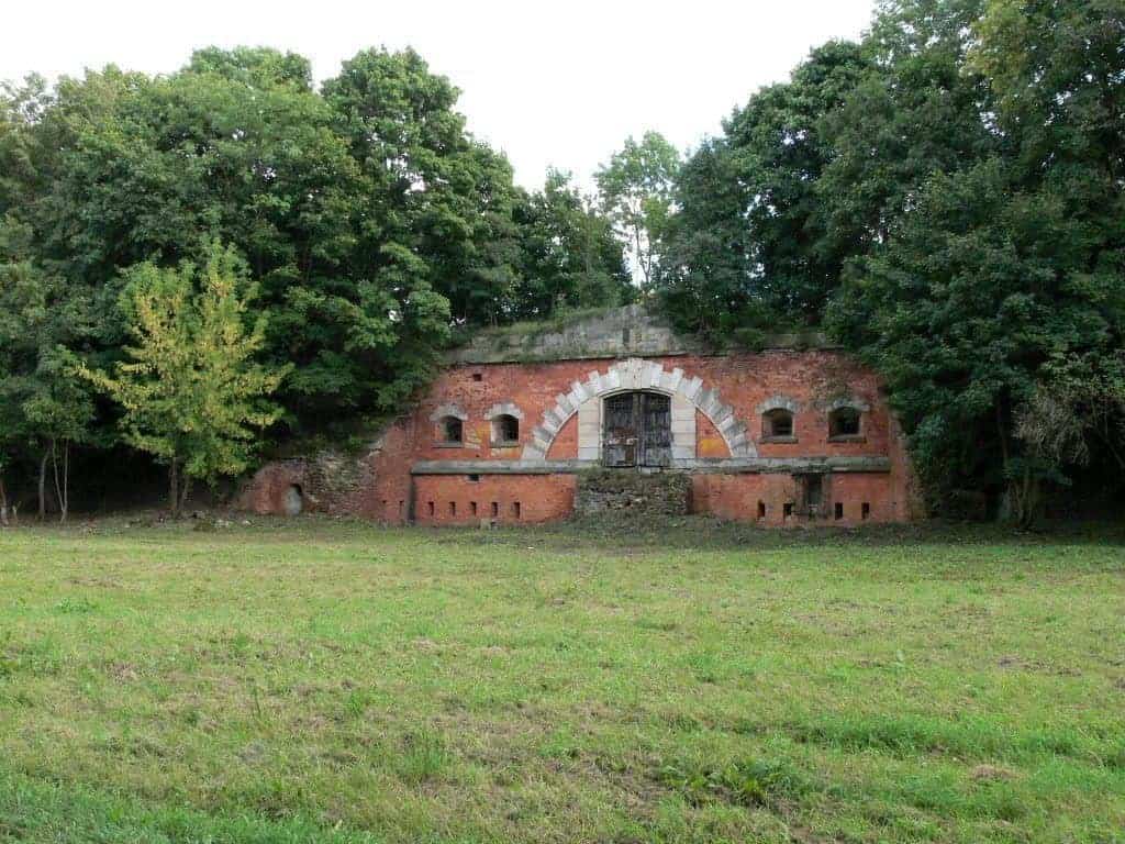 Huk wystrzałów doprowadził nas do Reduty Napoleona. Pochodzi ona z czasów Księstwa Warszawskiego i jest jedną z czterech zachowanych tu budowli murowanych. Jest to wieża artyleryjska, na parterze znajdowały się magazyny żywności, wody i amunicji, a pomieszczenia zewnętrzne stanowiły część bojową.