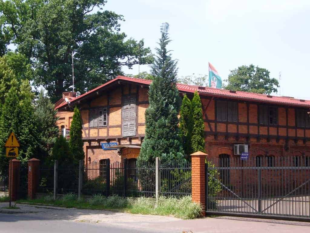 Na tle czerwonych budynków z cegły odróżnia się „Pałacyk Tyrolski” w stylu szwajcarskim wzniesiony przez Karola Dittricha w 1871 r.
