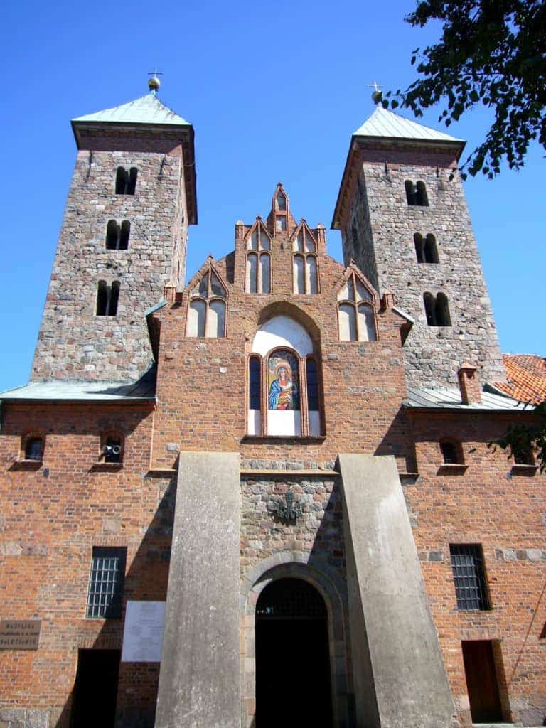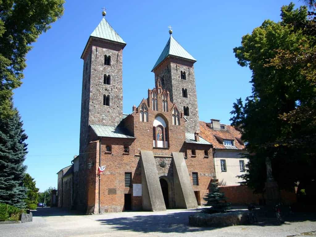 W dwóch wysokich wieżach, oprócz podwójnych okien, mieszczą się także strzelnice. Według legendy, ślady nacięć na lewej kolumnie portalu, to znaki pozostawione przez rycerzy zmierzających pod Grunwald. We wnętrzu kościoła znajdują się też największe w Polsce malowidła romańskie oraz freski gotyckie.