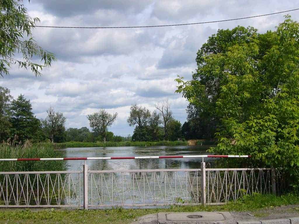 Naprzeciw kościoła widać staw, w którym hodowano kiedyś karpie.