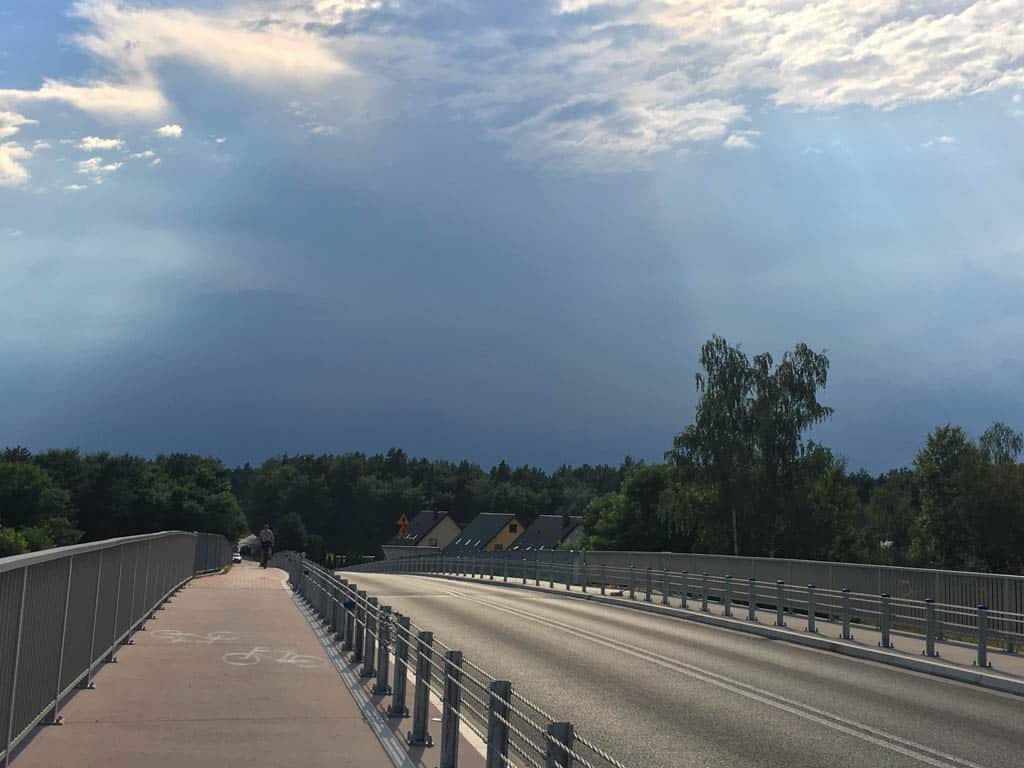 Upał mocno dawał nam się we znaki i zaczął nas wykańczać. Niestety po drodze nie mieliśmy praktycznie w ogóle możliwości ukrycia się w cieniu, jechaliśmy cały czas polnymi drogami lub tymi prowadzącymi między drobnymi drzewkami w okolicznych sadach. Kiedy niebo na horyzoncie zaczęło coraz szybciej ciemnieć, zapowiadając nie tyle złagodzenie upału, co gwałtowne burze, postanowiliśmy jednak nie ryzykować i trasę finalnie skróciliśmy. Po krótkim przystanku w Sobkowie zawróciliśmy w stronę Góry Kalwarii, a poniższe złowieszcze chmury całą drogę próbowały nas dogonić.